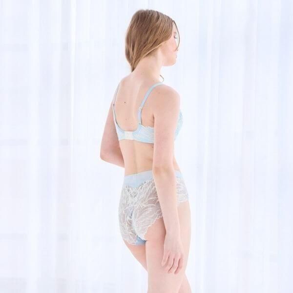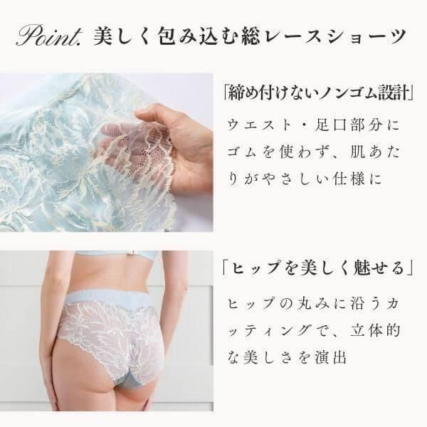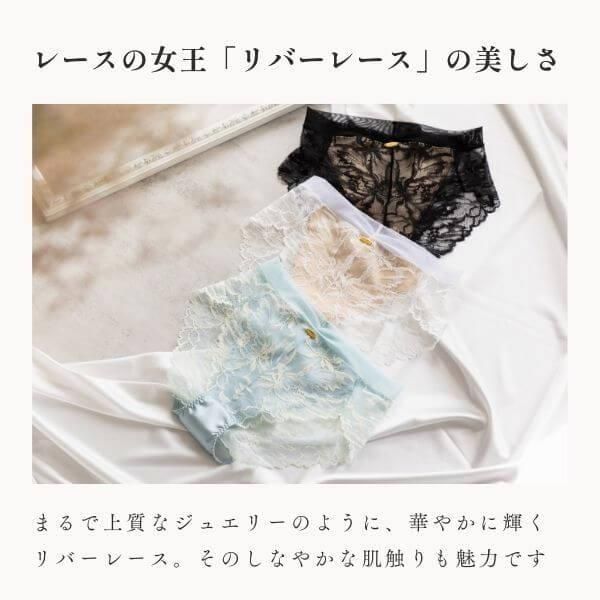 ヒップ全体をリバーレースで包み込んだ高級感あふれる美しいショーツ。ヒップのふくらみに合わせて立体的なフォルムをつくり出すカッティングで、リバーレースの生地が自然にヒップを包み込みます。
