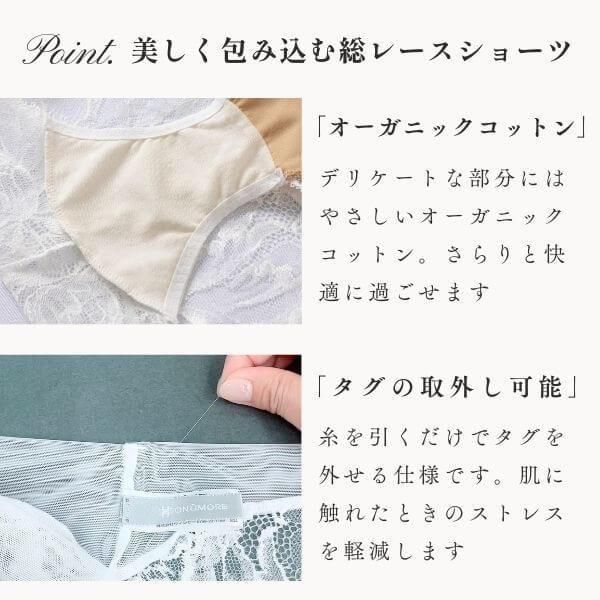 快適さへの配慮も忘れません。ノンゴム設計のウエスト部分は太めの生地を使用し、不快な巻き込みを防止します。足口もゴムを使わず、段差や締め付けを軽減。足さばきよく、軽快な動きをサポートします。レースの女王が醸し出す繊細なデザインと開放感あふれる心地よいはき心地をお楽しみください。