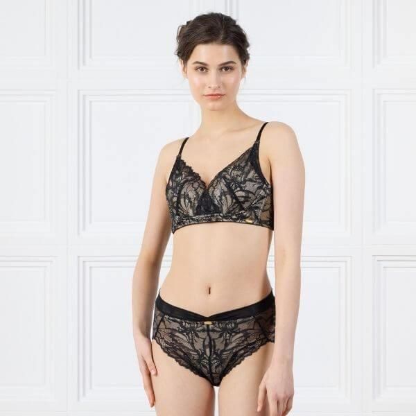 ブラのカップを覆う透明感のあるチュール生地の中には、レースの女王・リバーレースを使った繊細で上品な花柄のアップリケを忍ばせています。シンプルな中にもエレガントさを忘れません。