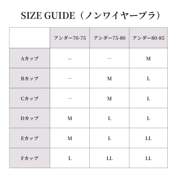 ONŪMOREのノンワイヤーブラジャーは、M、L、LLのサイズ展開をしております。下記の表を参考にサイズをお選びください。
