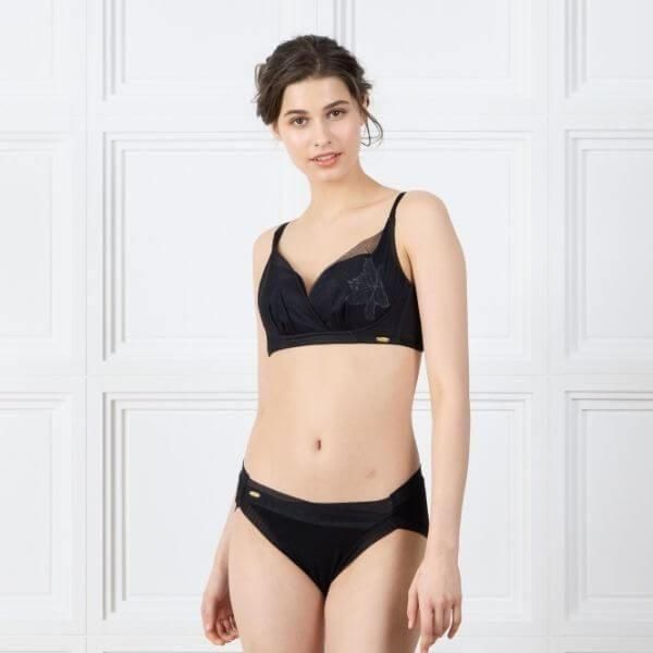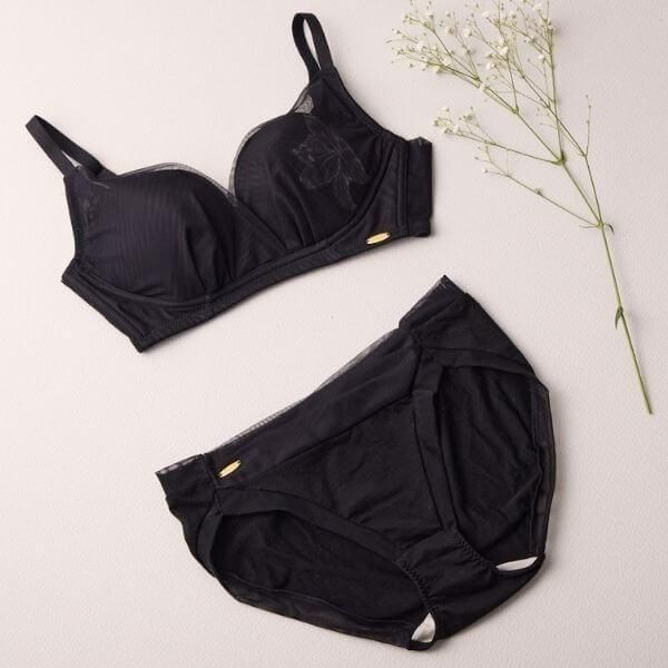 ブラのカップを覆う透明感のあるチュール生地の中には、レースの女王・リバーレースを使った繊細で上品な花柄のアップリケを忍ばせています。シンプルな中にもエレガントさを忘れません。
