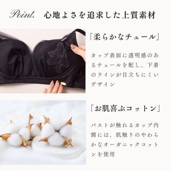 透明感のあるチュールをカップ全面に使用し、アウターに響きにくい仕様は軽さと肌さわりにも追及しデイリー使いとして幅広くご使用いただけます。