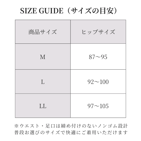 ウエスト・足口は、ノンゴム仕様で段差や締め付けを軽減しヒップをすっぽりと包み込んでくれる安心設計です。